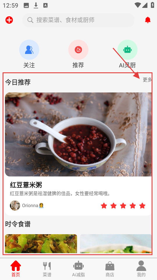 1、进入首页,有【今日推荐】等板块,点【更多】,可查看更多推荐内容,发现心仪菜谱。