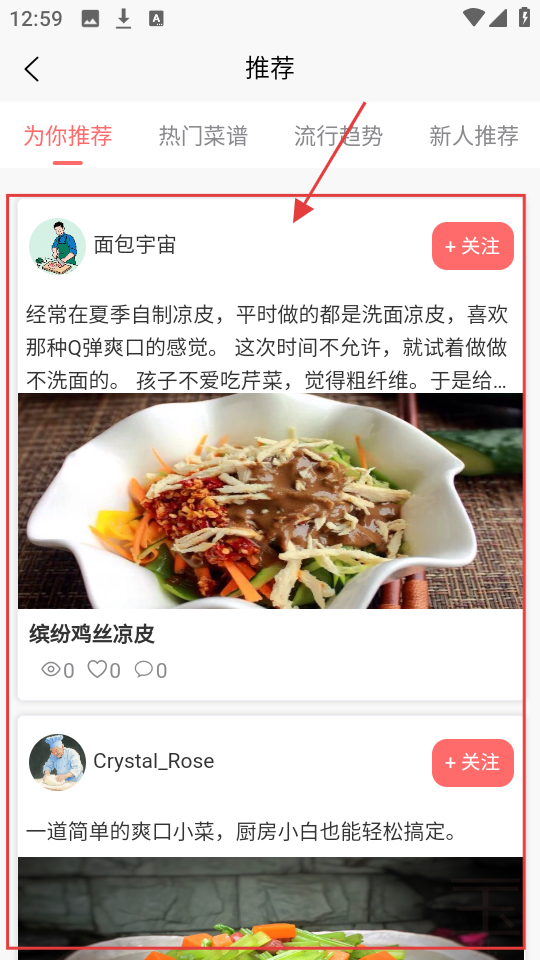 2、在推荐页,有【为你推荐】等分类,浏览推荐菜谱,选感兴趣的,如【缤纷鸡丝凉皮】,进入详情页。
