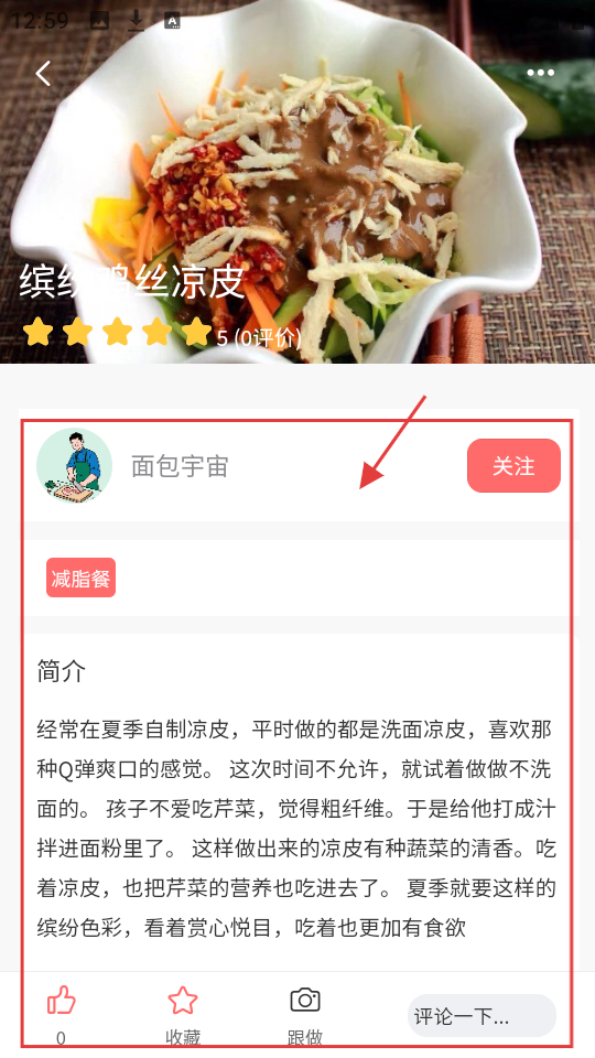 3、在菜谱详情页,可看菜谱简介、评分等,若喜欢作者,点【关注】,还能点赞、收藏或评论互动。