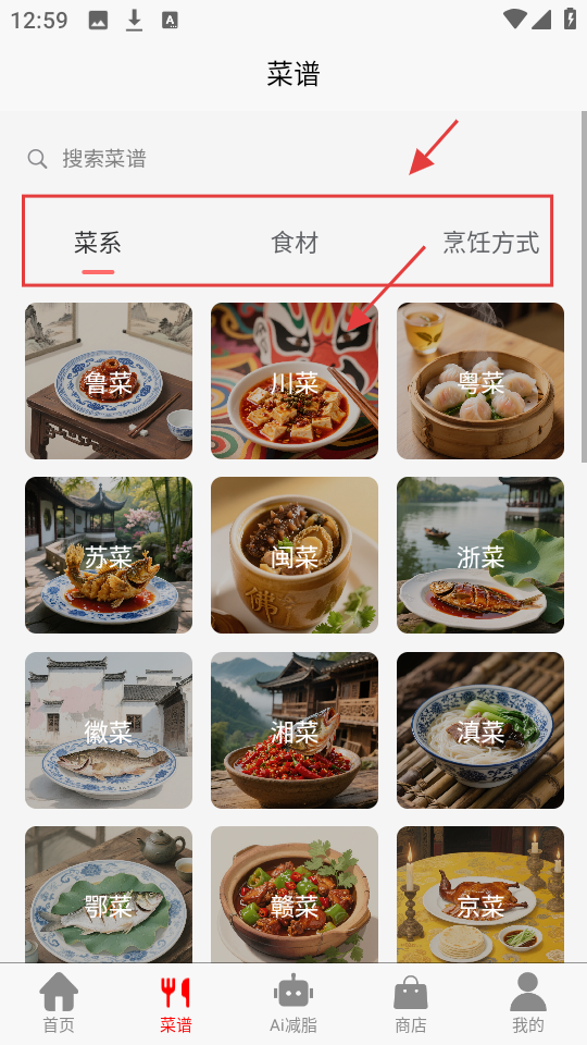 4、进入菜谱页,有【菜系】【食材】等分类,选菜系,如【川菜】,查看该菜系下的各类菜谱,挑选想做的。