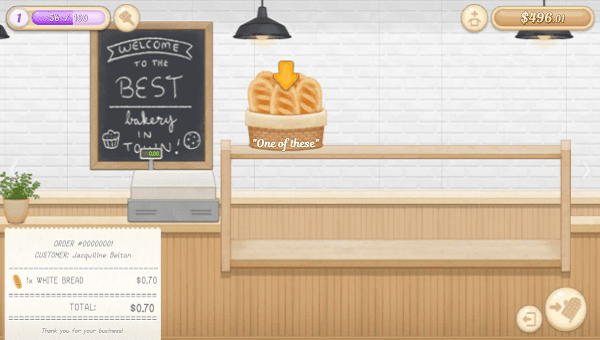 9.你直接点击感叹号,然后看到购买的物品点下,在此界面在点下绿色按钮,生成你的小票,在点击面包,放入收银台,在点击一下就售卖成功了。