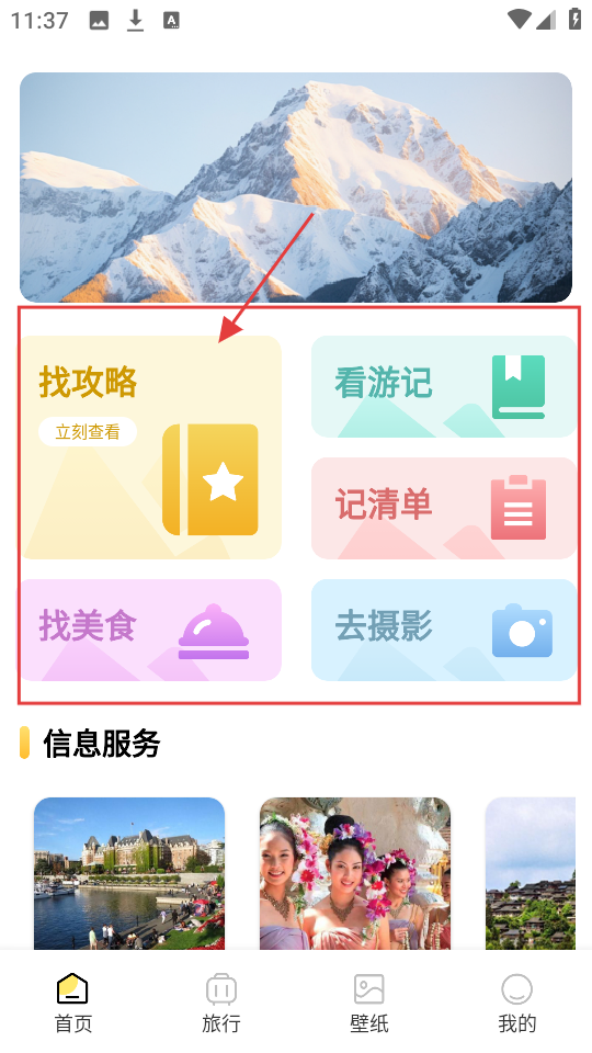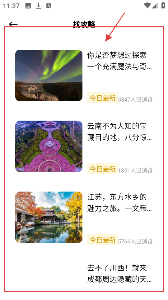 1、在首页,有【找攻略】【看游记】等功能,点【找攻略】,进入攻略列表页。