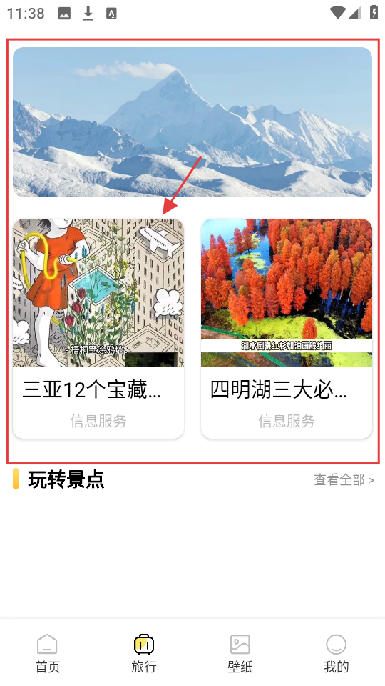4、切换到旅行页,有【三亚12个宝藏...】等信息服务卡片,选卡片,获取对应旅行地点的信息。
