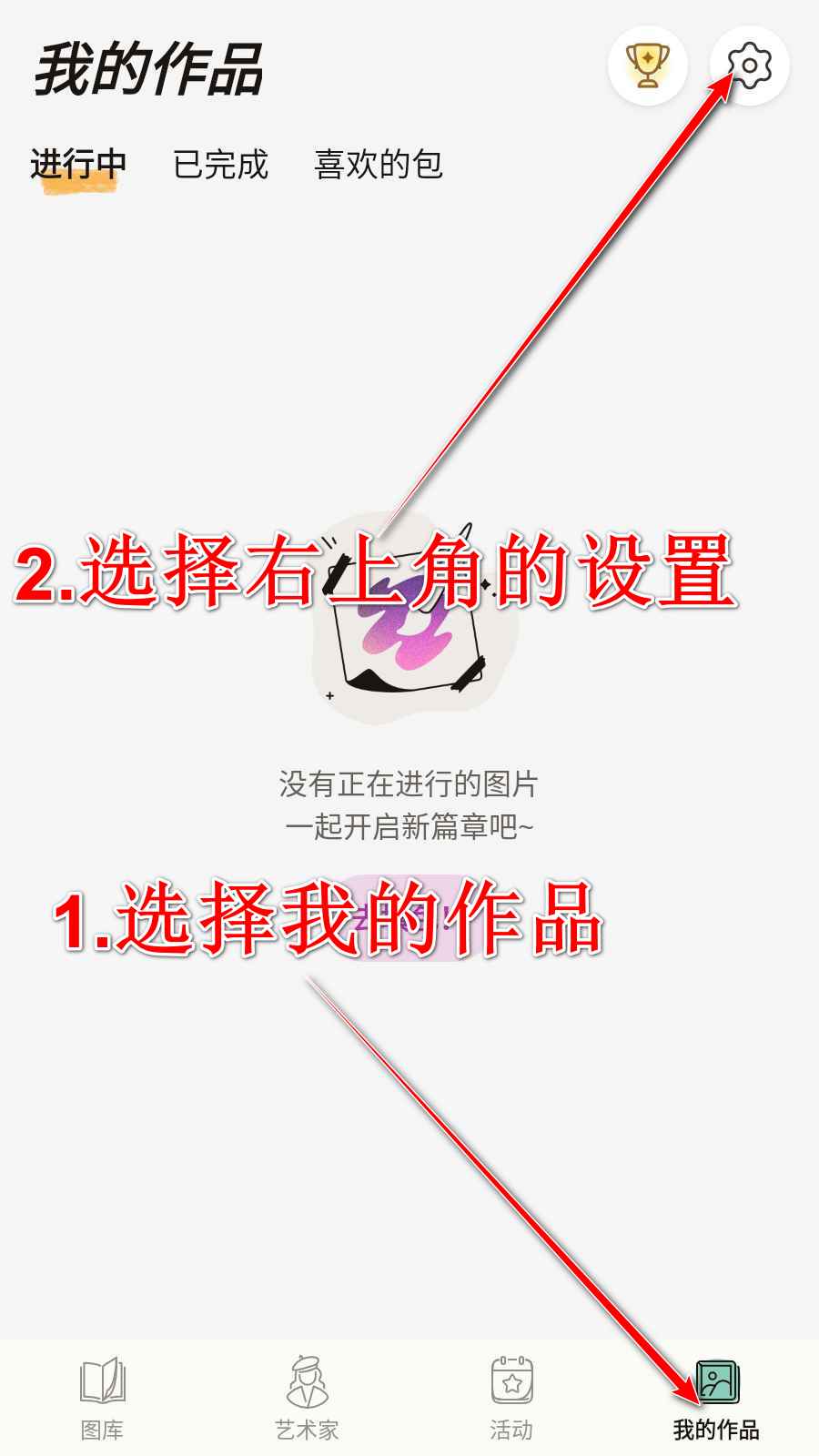 14.进入数字填色,选择右下角我的作品然后选择右上角的设置。