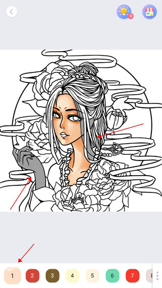 3.进入后,在下方选择与图中数字相对应的颜色,然后再点击对应的区域就可以一秒上色了。