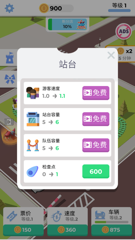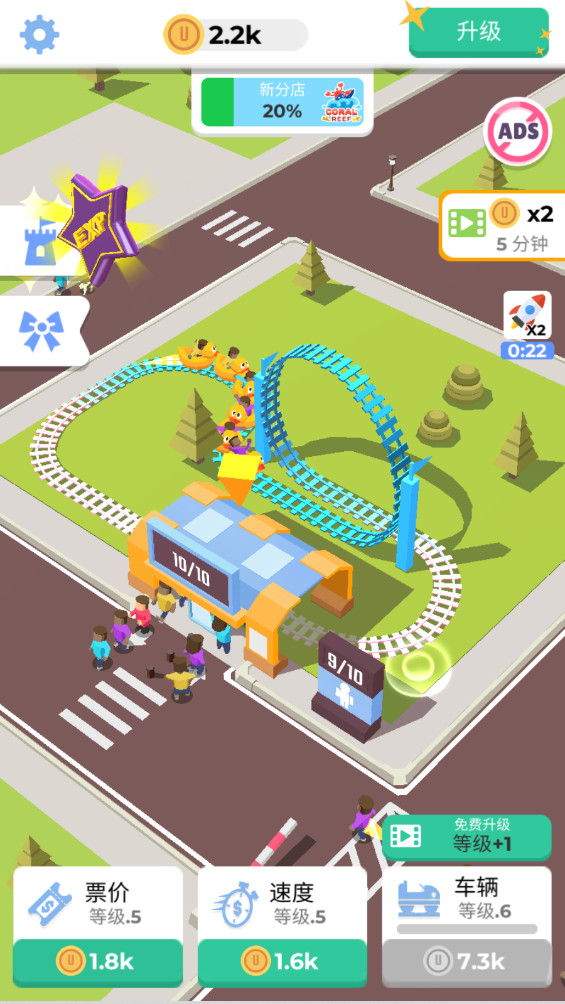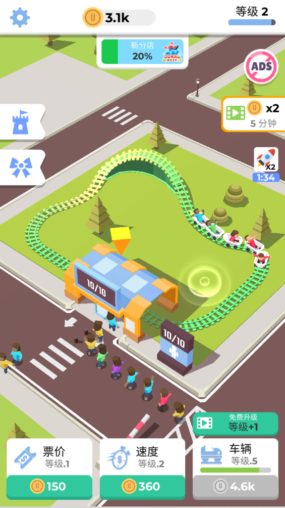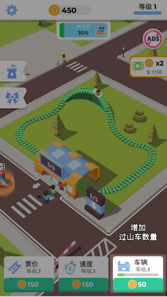 1.进入游戏之后,你的过山车会自动运行,但是一次只能载一名乘客,所以要点击增加过山车数量。