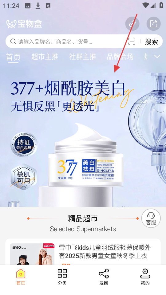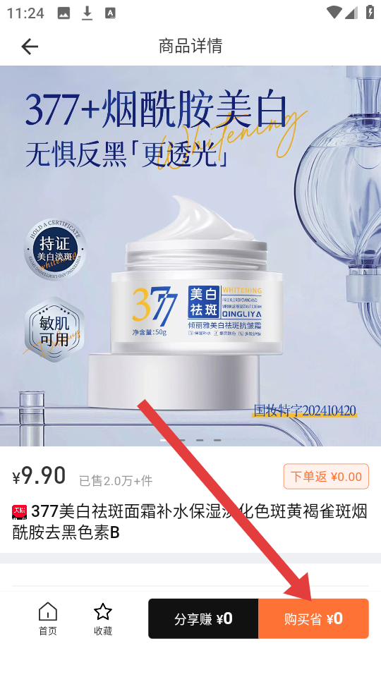 1、在首页,有377+烟酰胺美白等商品展示,选感兴趣的商品,进入商品详情页。