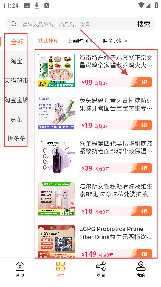 3、到分类页,有淘宝、天猫超市等平台分类,选商品所在平台,查看该平台商品列表。
