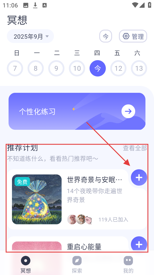 1、在冥想页面,推荐计划里有【世界奇景与安眠…】,点其旁【+】,进入该计划详情页。
