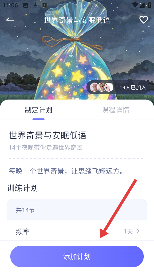 2、在【世界奇景与安眠低语】计划详情页,查看课程介绍后,点【添加计划】,将计划加入。