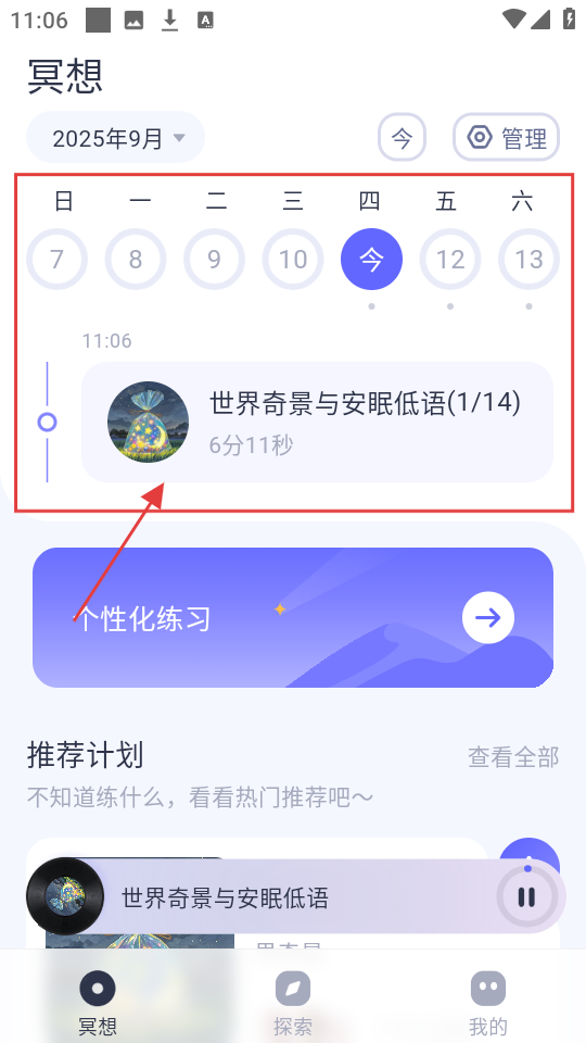 3、添加计划后,回到冥想页,能看到【世界奇景与安眠低语(1/14)】,点它进入冥想练习。