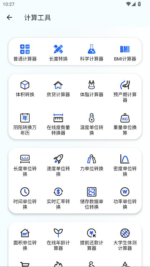 当你点击进入"计算工具"部分时,会展示出各种类型的计算器,包括常用的数学计算、单位换算、日常生活中的常见计算需求等。用户可以根据具体的需要,选择不同的计算器,使用起来非常方便快捷。