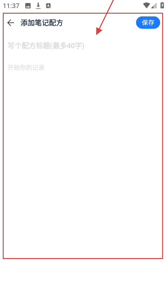 2、进入添加笔记配方页面后,填写配方标题和记录内容,之后点击【保存】,配方就记录好啦。