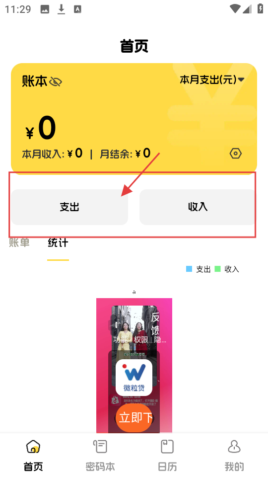 1、在首页,若要记录支出,点击【支出】按钮,即可进入支出记录页面。