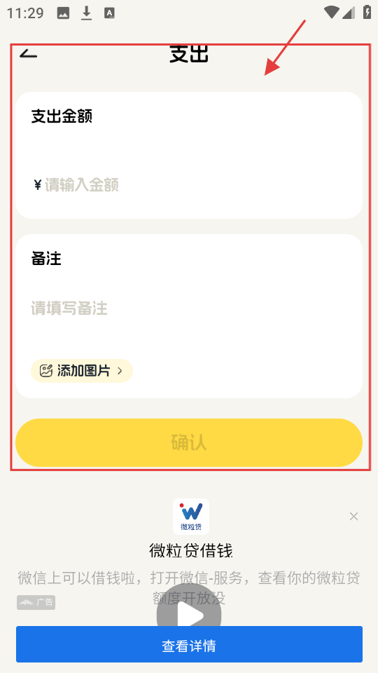 2、进入支出页面后,填写支出金额和备注等信息,之后点击【确认】,支出就记录好啦。