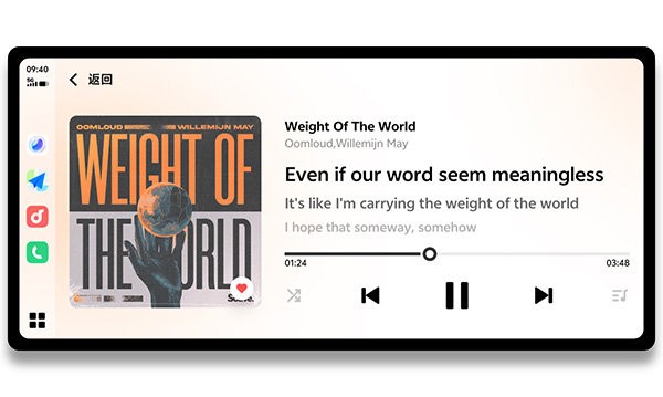 3、连接后,手机虚拟屏幕投射至车机中控屏幕,界面布局类似CarPlay,左侧为应用入口,右侧显示导航、日程和音乐,操作更高效。