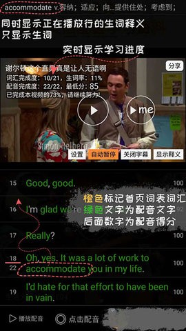 2、跟随听力一边读一遍听可以很好的训练用户的口语能力,念出一口流程的口语。
