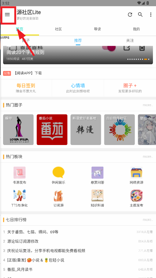 2、在首页切换至推荐,即可查看七日排行榜的书源。