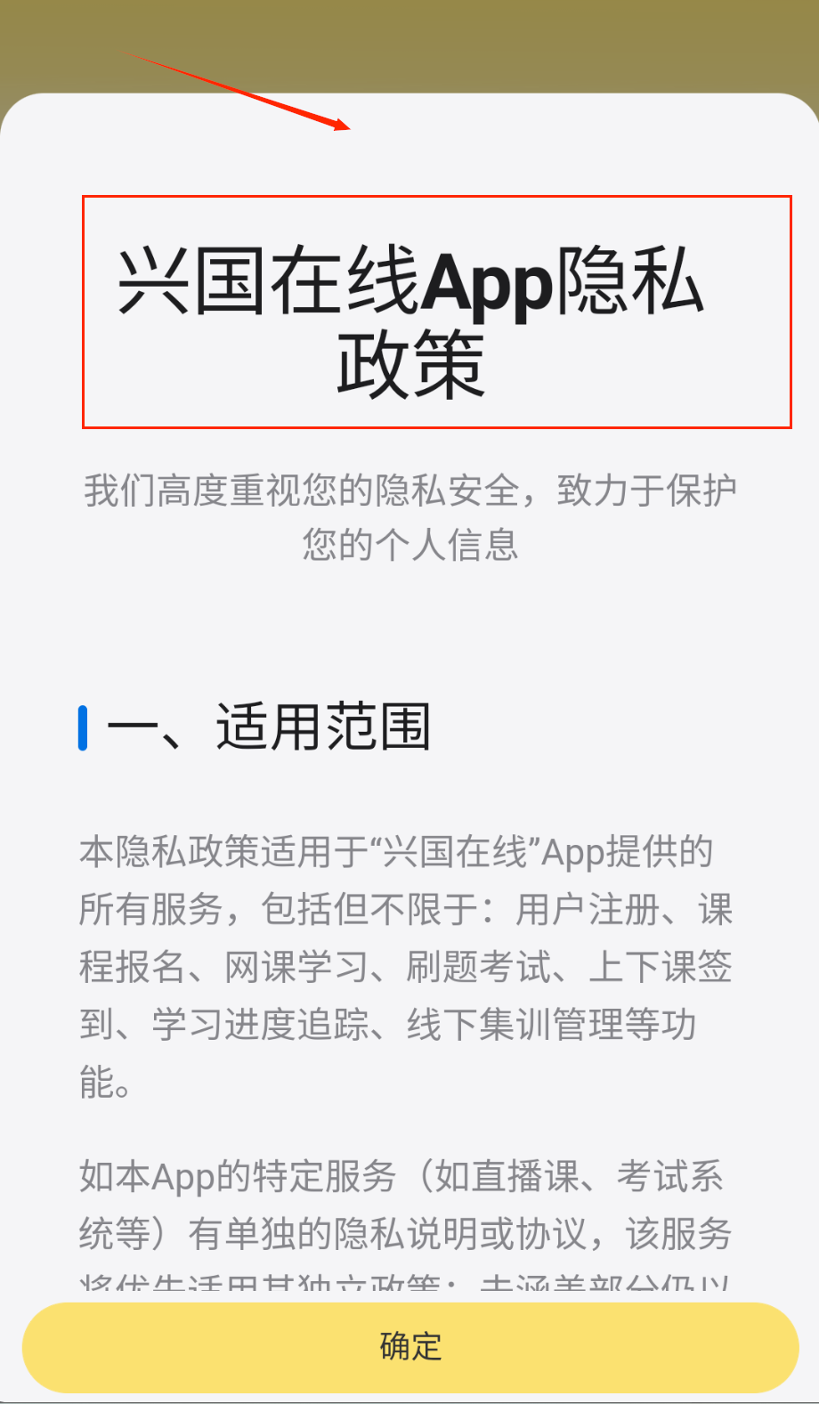 1、首次打开应用会弹出隐私政策窗口,上方清晰标注兴国在线APP隐私政策标题,下方详细说明个人信息保护范围与适用场景。