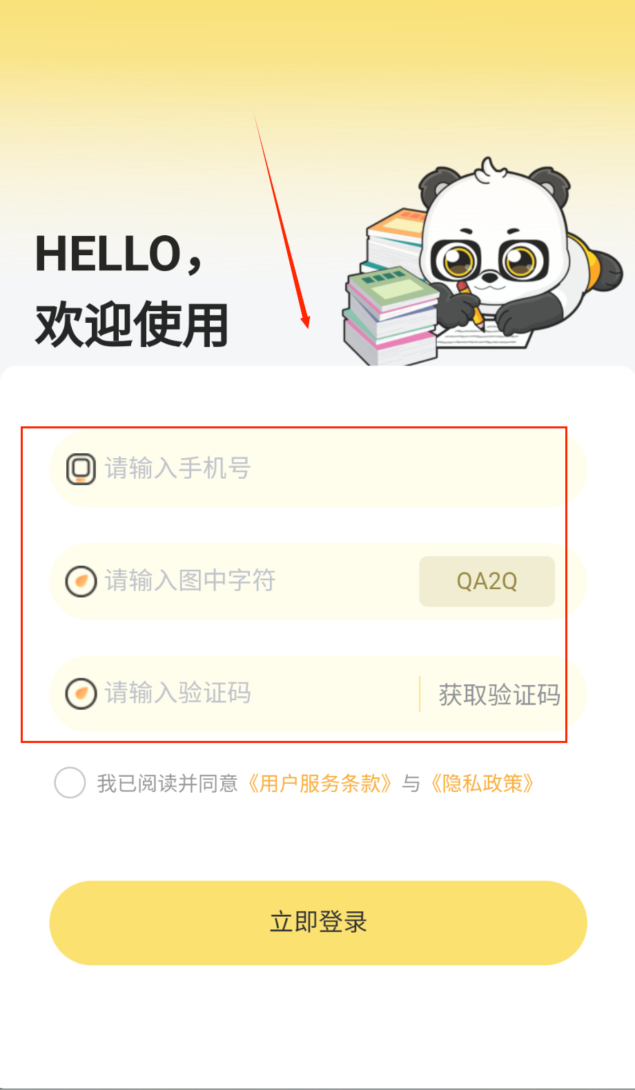 3、新用户登录时会看到温馨的熊猫欢迎界面,在渐变黄色背景上按顺序完成三步操作:输入手机号码、填写右侧显示的验证字符。