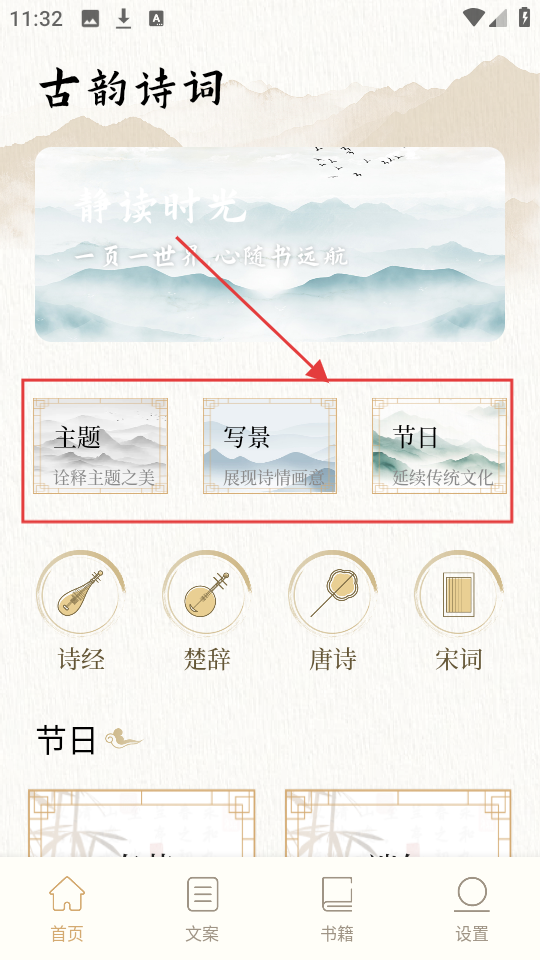 1、进入首页有【主题】【写景】【节日】等分类,想找对应诗词,选分类就行,超方便。
