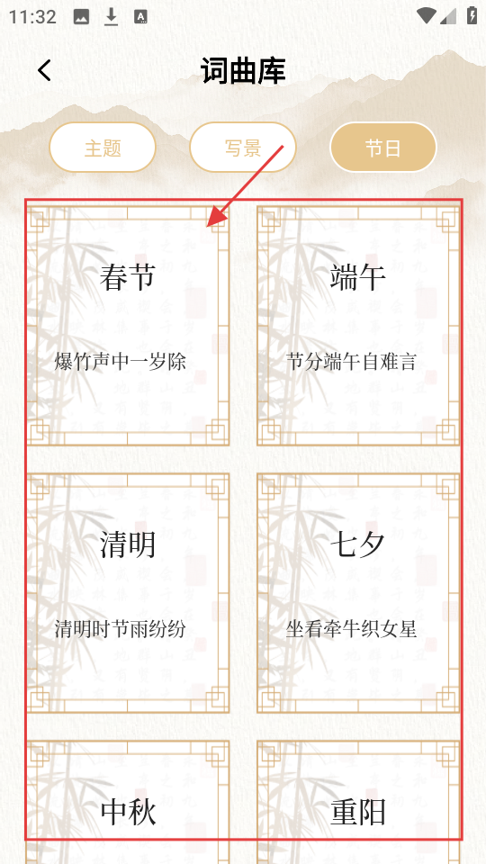 2、进入节日分类的词曲库,有【春节】【端午】等节日诗词,挑喜欢的节日,查看相关诗词。