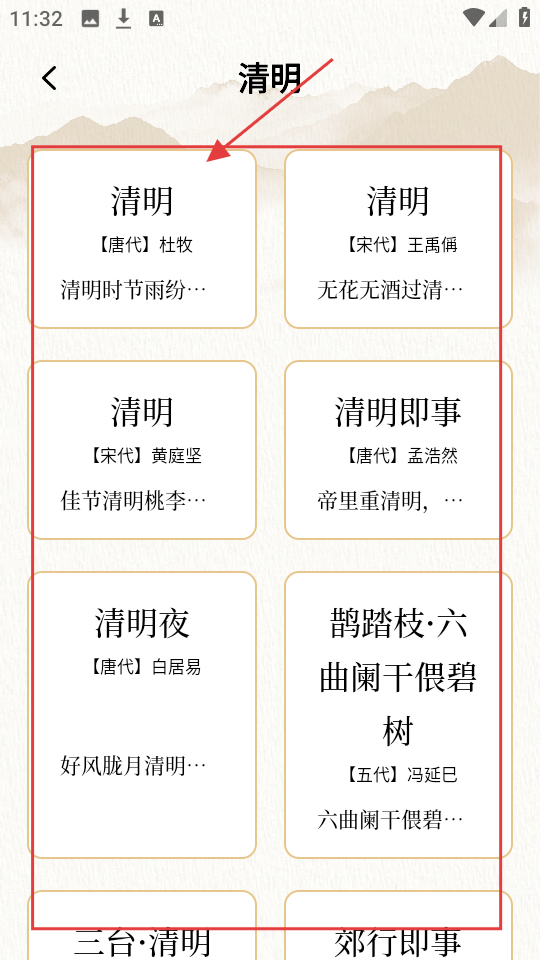 3、选清明,能看到不同朝代关于清明的诗词,像【唐代】杜牧的《清明》,选它就能看详情。