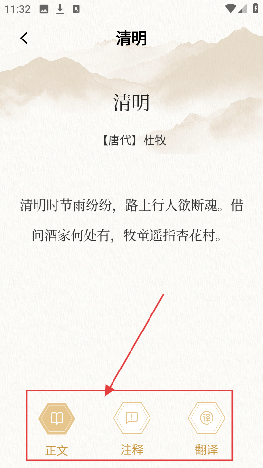 4、点开【唐代】杜牧的《清明》,能看正文,还能点“注释”“翻译”,深入了解诗词,超棒。