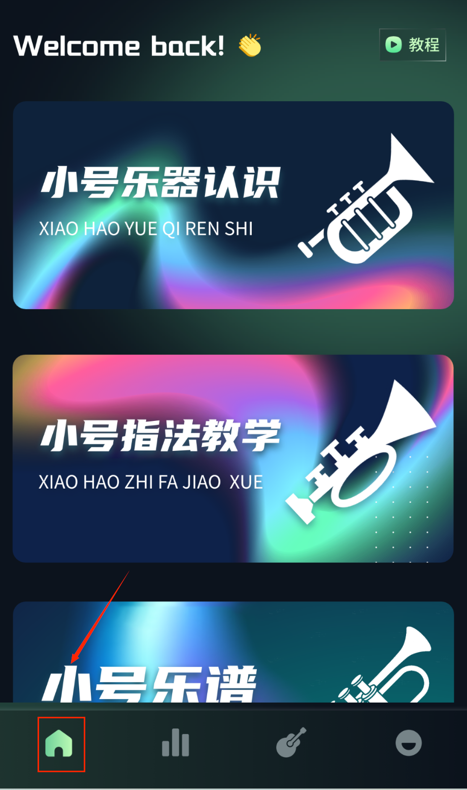 1、下载安装号易节拍APP后打开应用,首页可浏览乐器教学板块与科普内容,根据个人兴趣选择学习方向。