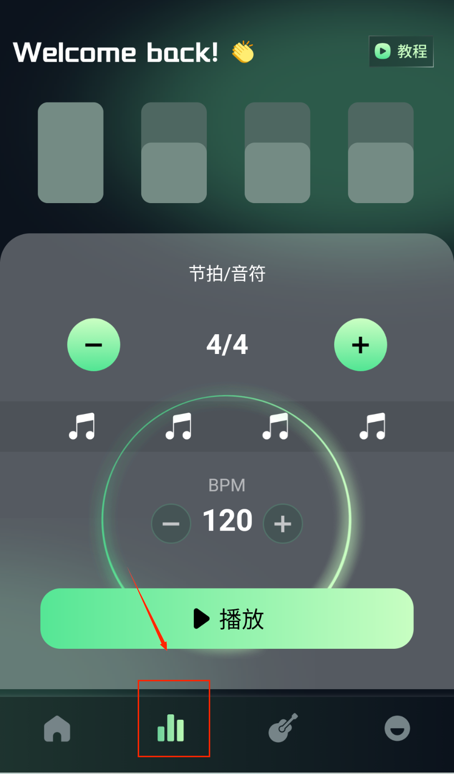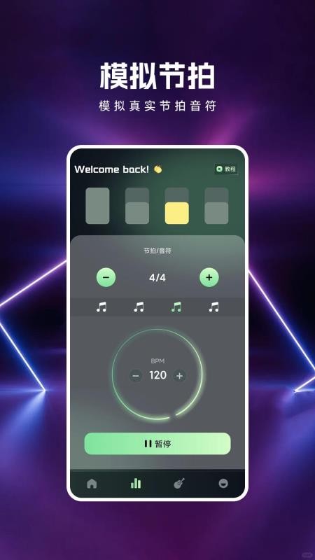 2、进入模拟节拍器界面调整节拍速度与音符类型,通过实时模拟音效进行节奏练习并支持随时暂停修正。