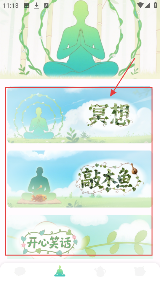 3、还有【冥想】【敲木鱼】【开心笑话】等分类,想换种解压方式,选这些分类试试。