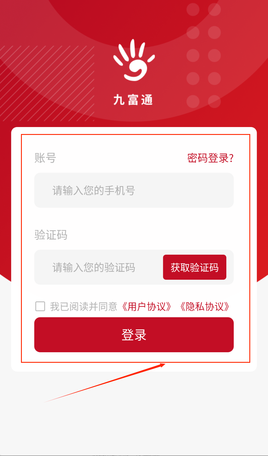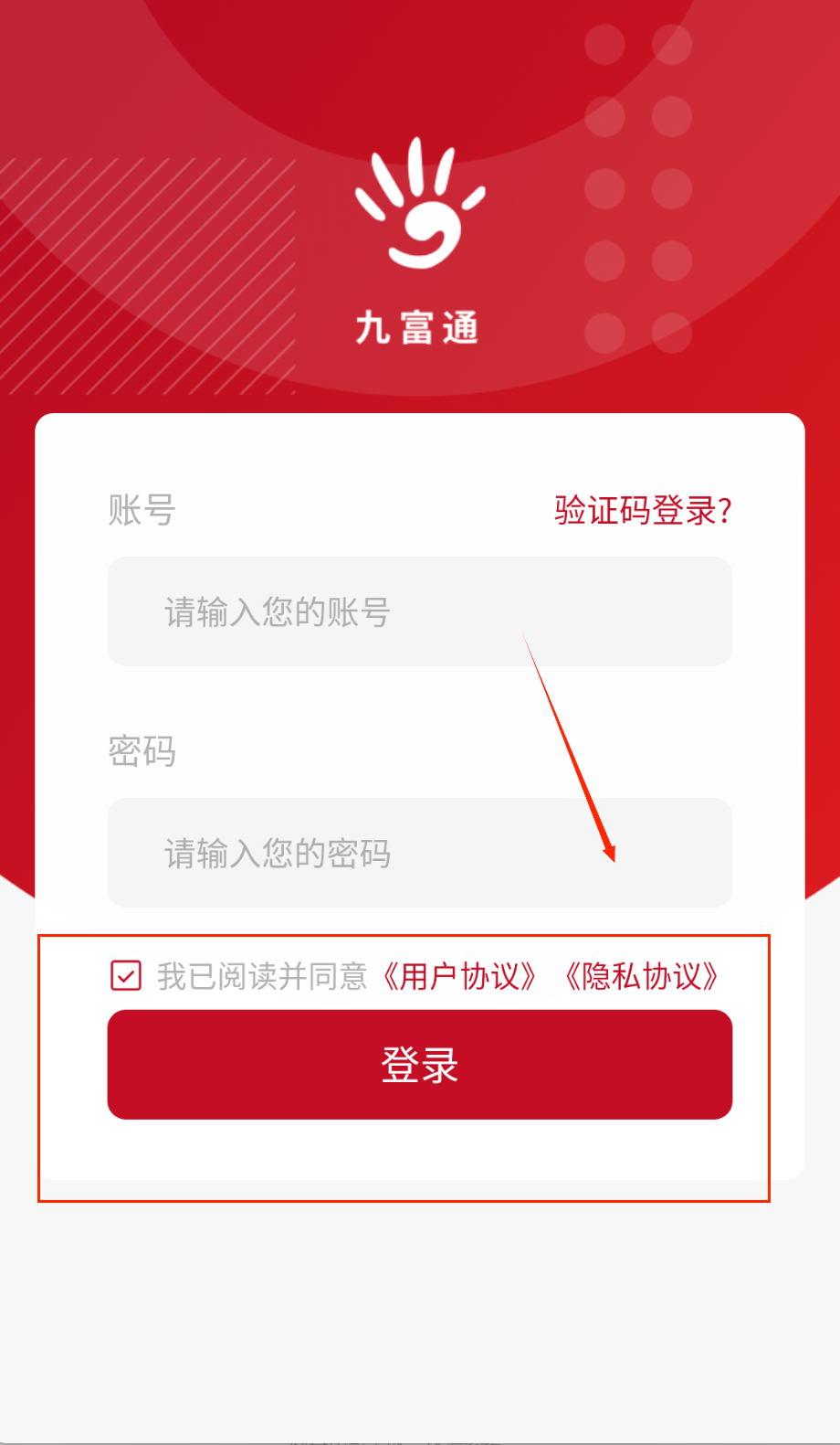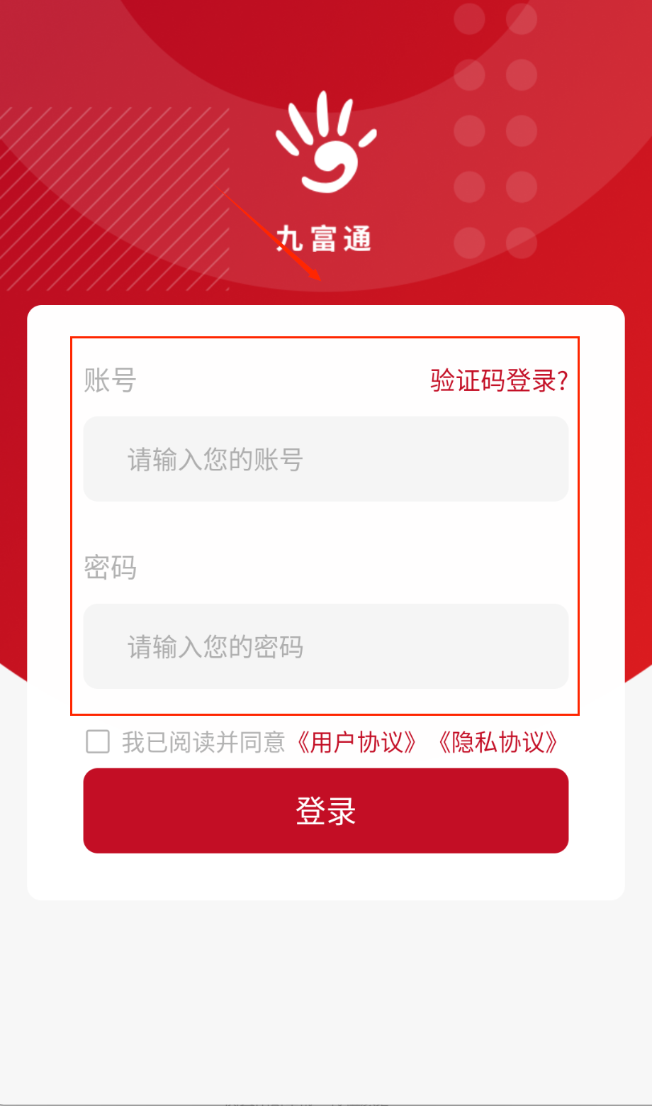 1、 打开软件后呀,首先会看到红色背景的登录界面,顶部显示当前时间和“九富通”白色logo。在“账号”框输入你的注册手机号或用户名。