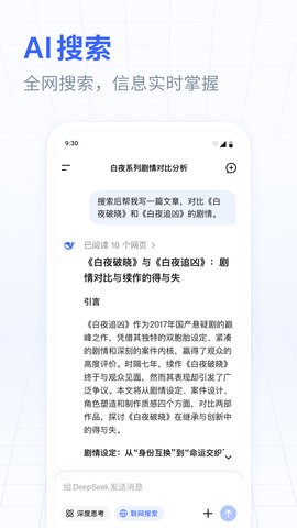 deepseek免费软件官方作为一款由深度求索公司于2024年发布的顶级AI语言大模型。相比其他严肃沉闷的国产AI,deepseek有着赛博该溜子的称号,有着调皮的性格。内置顶级的深度思考能力,还能为用户智能搜索全网内容,给出最优解的答案,欢迎下载尝试。