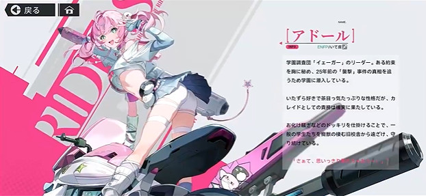 在交融战争开始的时候,第一个出现在领航员面前的神秘金发少女。外表看起来漫不经心,似乎还背负着无法用言语表达的使命。由于有些欠缺常识,不经意间会做出令人不禁微笑的举动。