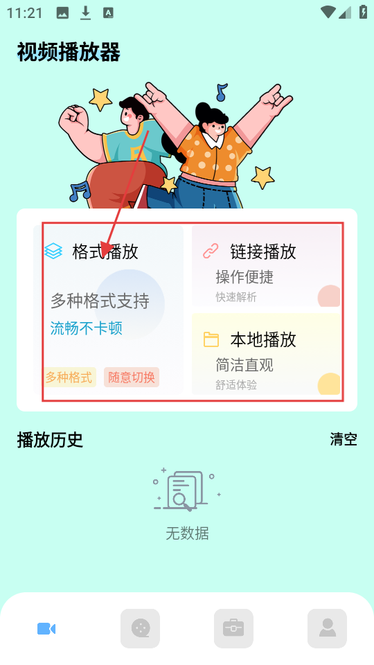 1、打开应用首页有【格式播放】等功能,【格式播放】支持多种格式,播放还流畅不卡顿,超实用。