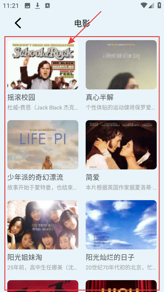 3、进入电影分类,有好多电影可选,像【摇滚校园】【少年派的奇幻漂流】等,选喜欢的点进去。