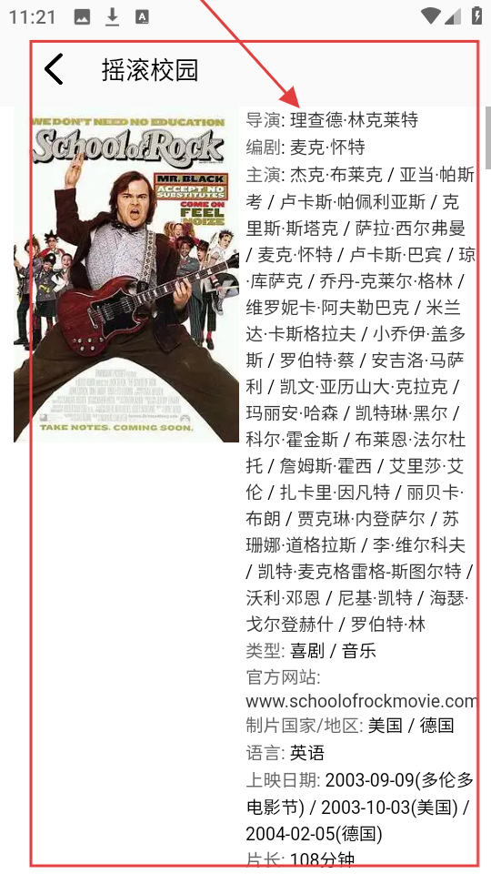 4、点开【摇滚校园】,能看到导演、主演等详细信息,了解这些,能更好判断是否想看这部电影。