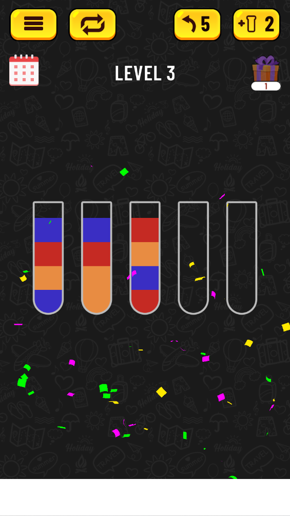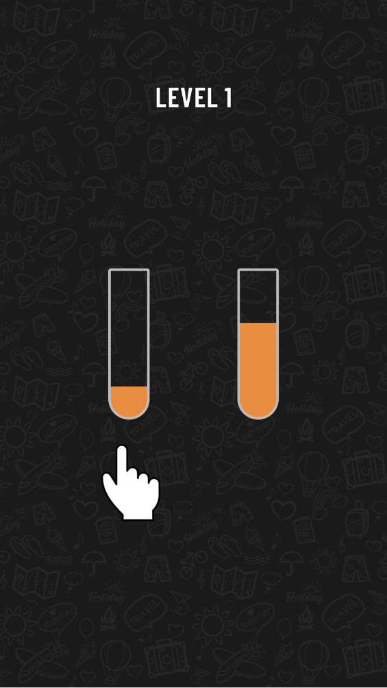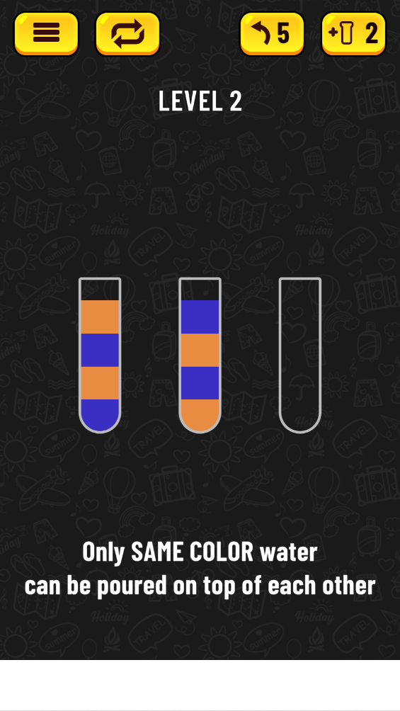 2.游戏开始时会有简单的提示,将液体排序分类倒入同一个瓶子内。