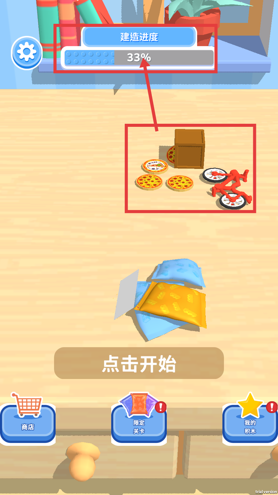4、完成物品寻找后,可查看【建造进度-33%】了解当前建造情况,再点击【点击开始】推进游戏。