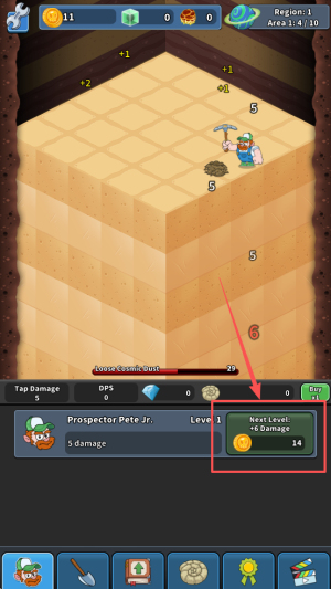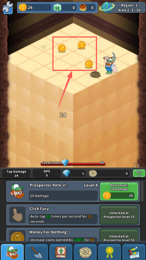 4、收集金币。挖掘到的金币会自动收集,用于升级和购买。