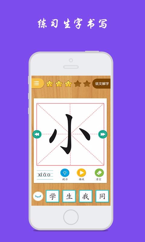 《小学生写汉字》是一款汉字书写学习软件,同步课本提供生词列表,您可以在线同步课堂学习,它有一个解释版块,用图片和文字为你解释汉字。可以在线练习写字,播放笔顺动画了解书写顺序,播放语音查汉字读音。可以随时查看生词表的学习进度和情况,以星级的形式展示学习情况,并提供对应的错题库。