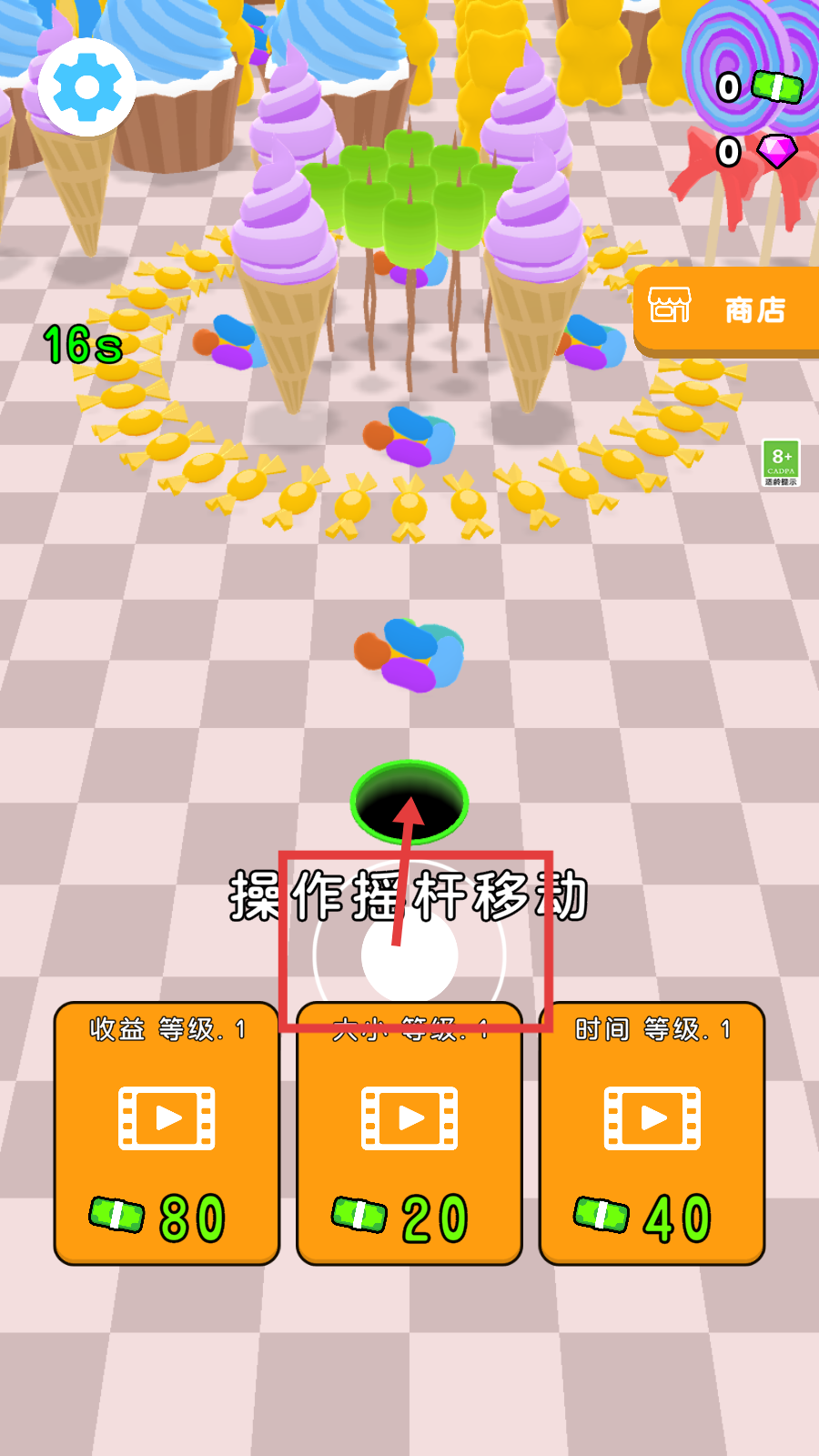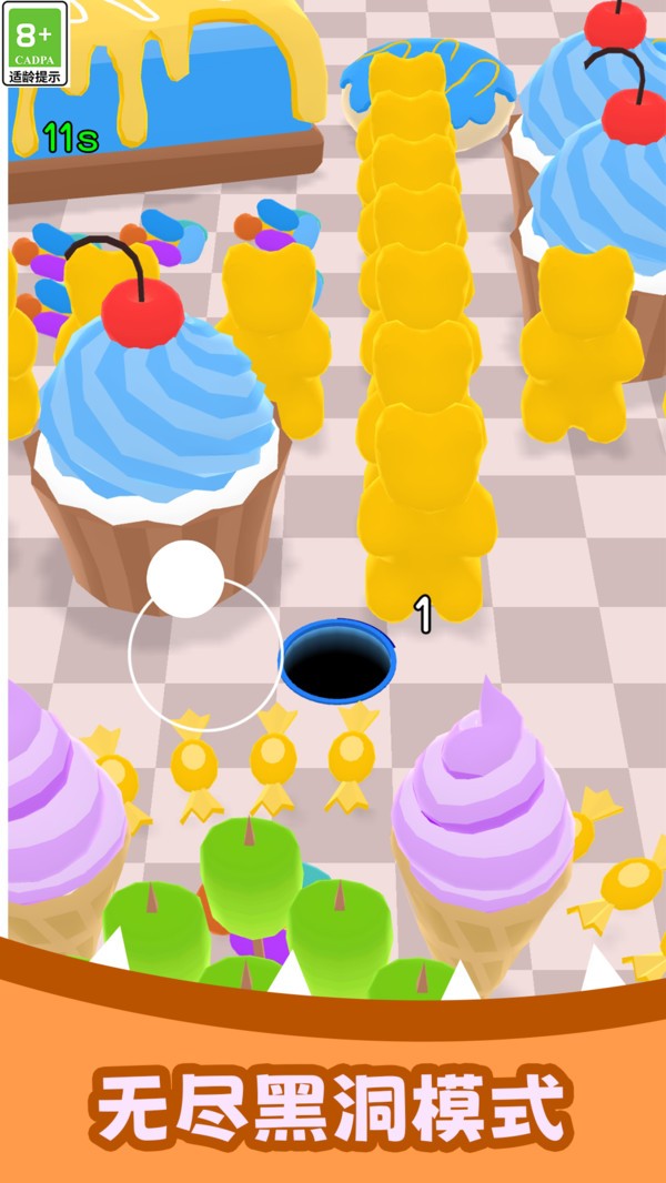 1、进入游戏后,通过【操作摇杆移动】控制黑洞,在糖果场景中移动,准备收集各类糖果。