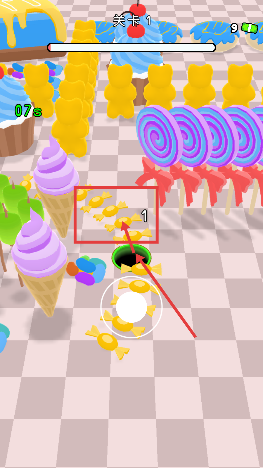 2、在【关卡1】中,操控黑洞靠近黄色糖果,将其吸入,不断积累收集的糖果数量。