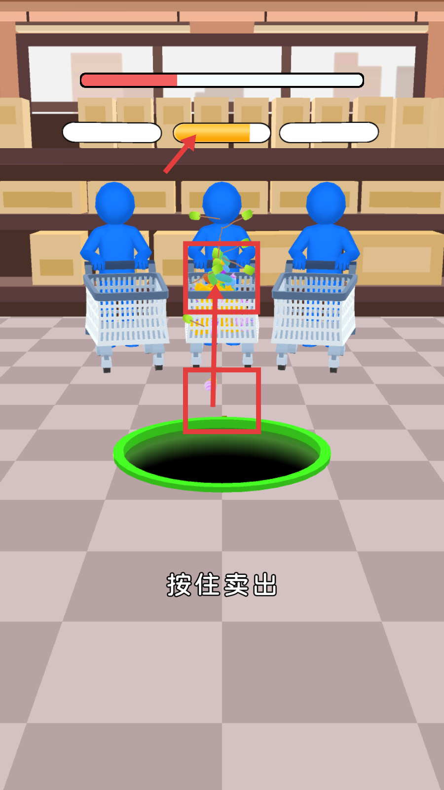 3、收集足够糖果后,进入商店场景,将糖果放入蓝色小人的购物车,然后【按住卖出】,推进进度条。
