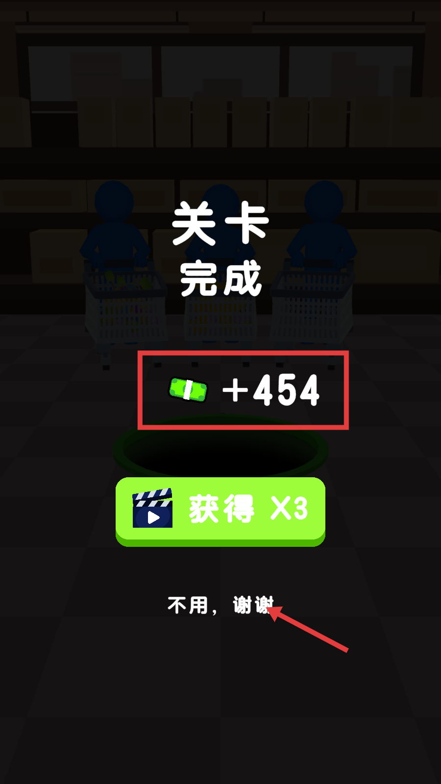 4、成功卖出糖果后,【关卡完成】,可获得+454金币奖励,若不需要多倍奖励,点击【不用,谢谢】即可。