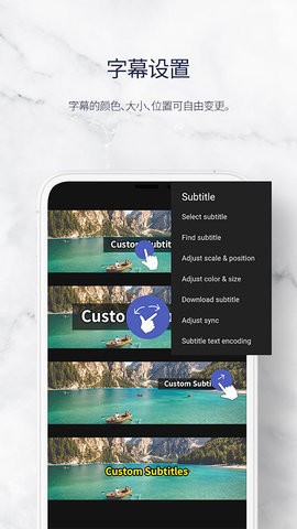 用户可自由调整字幕的颜色、大小和位置,并通过内置的字幕下载功能轻松获取适配字幕。