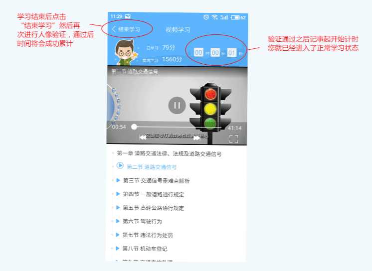 如下图所示,点击理论学习。人像验证通过之后,学员可根据时钟 00:00:00 是否计时来判断系统是否记录学时。(注意:人像验证通过之后,计时器才会走 )