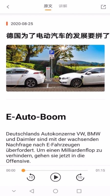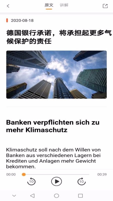 《德语说》是一款学习德语的软件,可以在这里阅读德语新闻资讯,在阅读过程中可以接收到国外新闻内容,同时提高您的德语学习能力。主要推送一些文章类的信息内容,你可以从阅读中心找到你喜欢的文章在线阅读,在阅读过程中会为用户提供相应的双语讲解,可以帮助你阅读整篇文章。