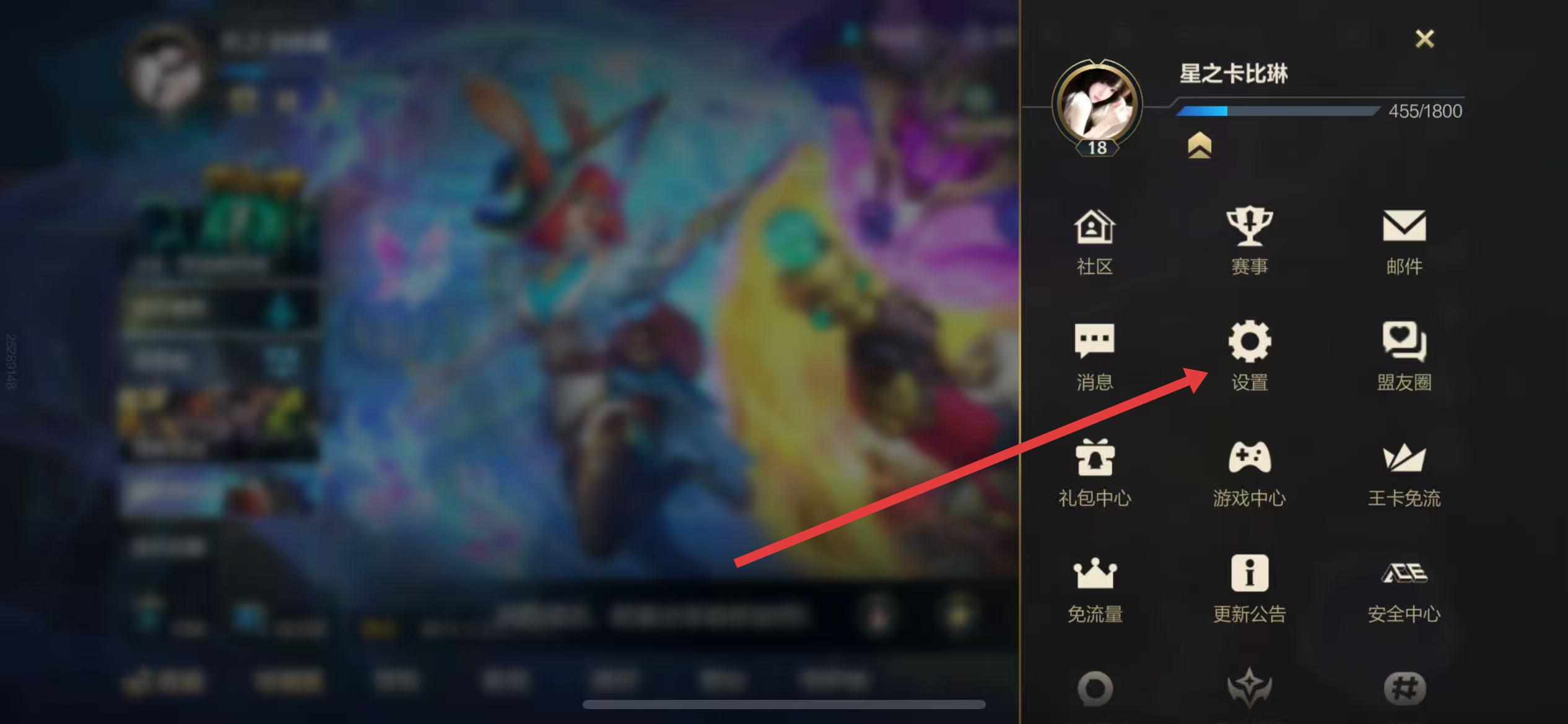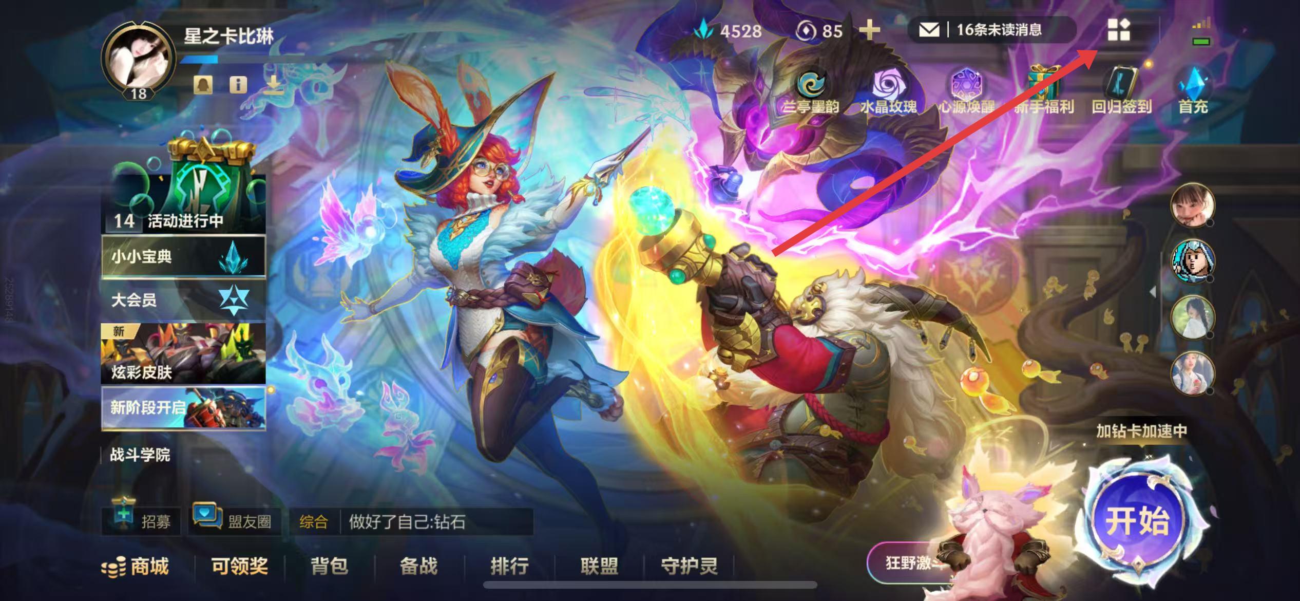 1、打开英雄联盟手游,进入游戏主界面,点击右上角的菜单进入该页面。