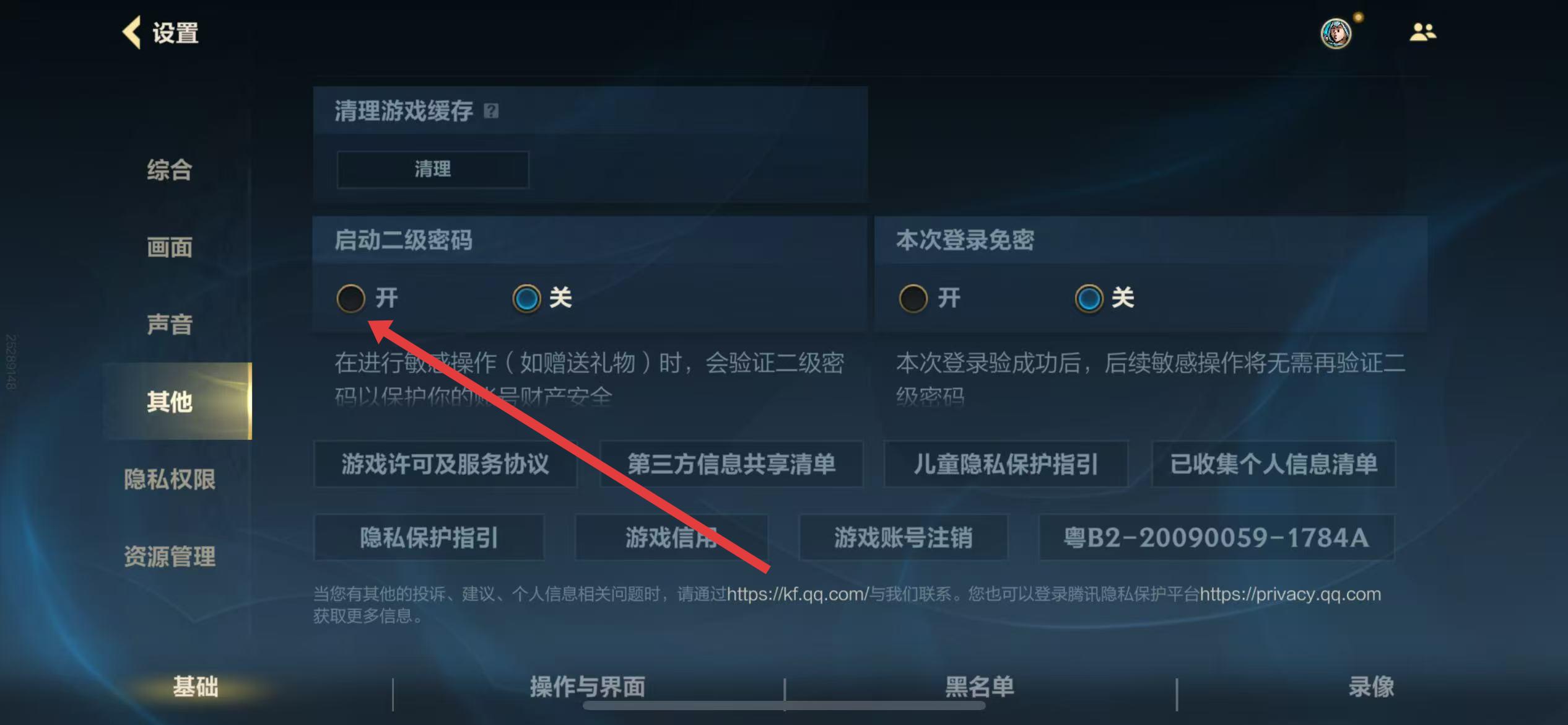 4、在其他设置页面,找到启动二级密码选项,点击开,按照后续提示完成二级密码的设置操作。